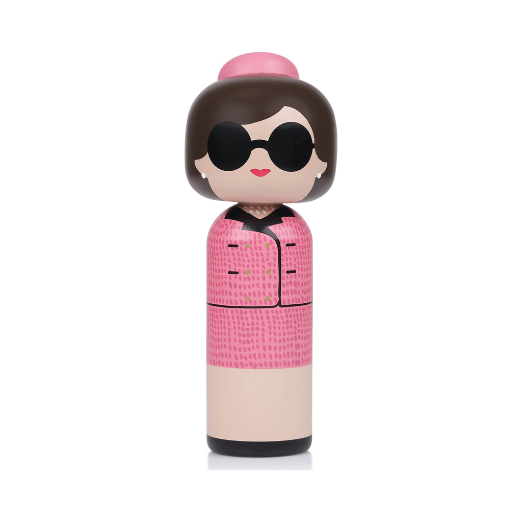 With her iconic pillbox hat and pink Chez Ninon skirt suit, the Jackie Kokeshi Doll from Lucie Kaas depicts fashion icon and First Lady Jacqueline Kennedy. Known for her graciousness and keen sense of fashion, Jackie Kennedy made a lasting impression on the American public and has gone down in history as one of the most fashion-forward First Ladies. Crafted from superba wood, this handpainted doll is ready to be put on display. Ideal for the fashionista or political junkie in your life, this doll looks great on a mantle, walk in closet shelf, or coffee table.