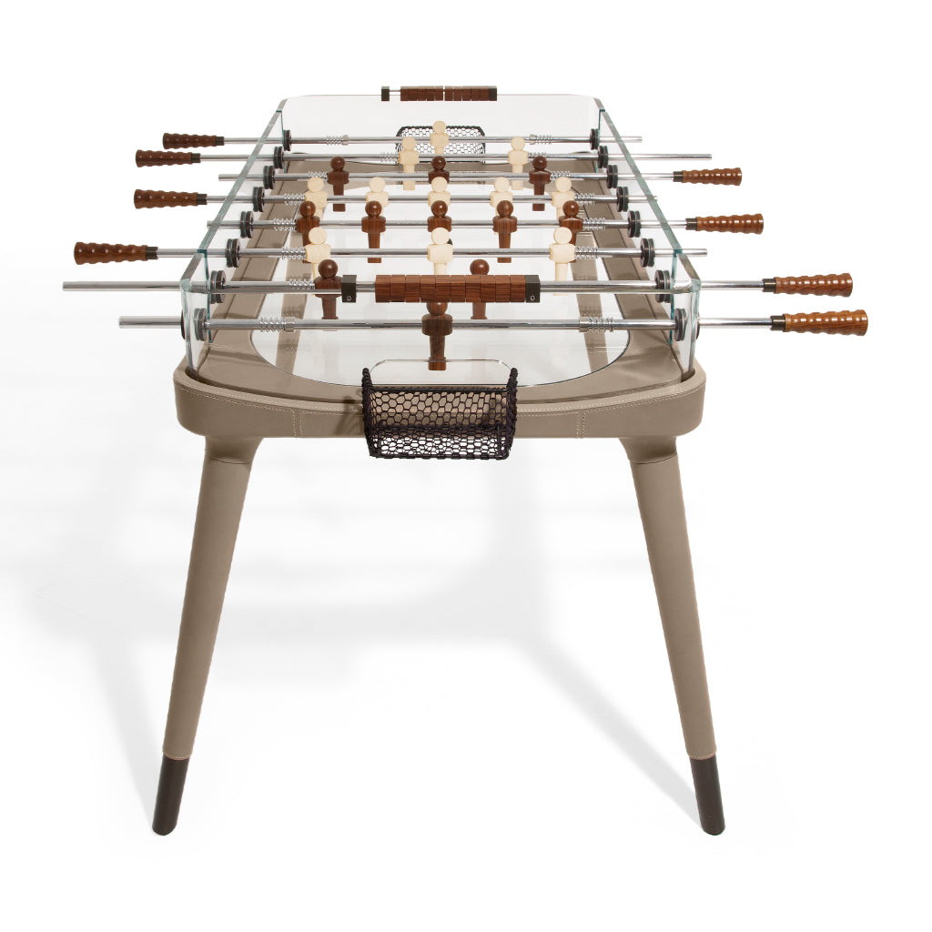 Table football in crystal glass and saddle leather, with knobs and players in pau ferro and ash wood.