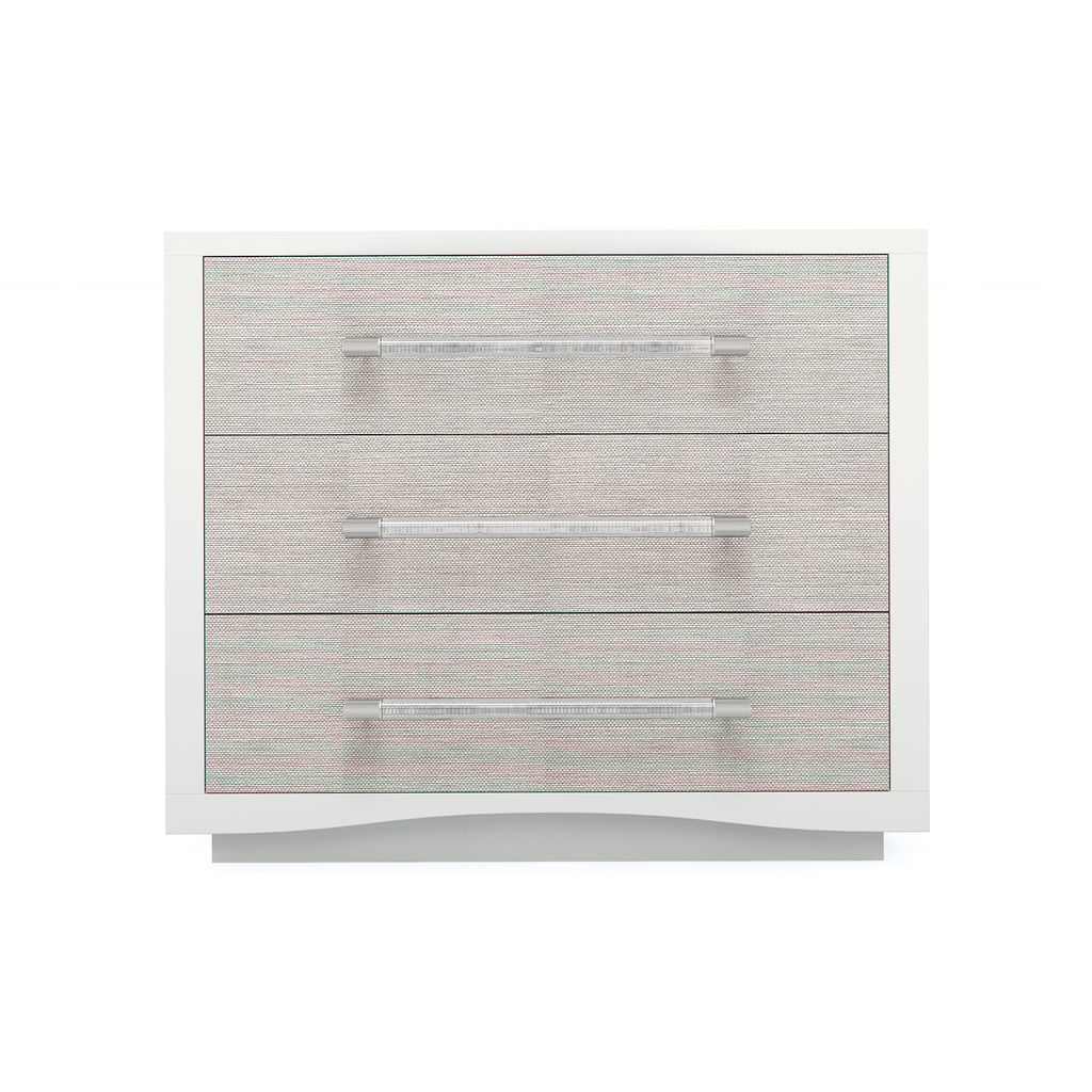 A glamorous fusion of natural texture and contemporary style, the A Clear Touch 3-Drawer Chest from Caracole is a study in refined material contrasts. This beautiful chest is defined by its unique drawer fronts, which are wrapped in intricately woven raffia with a shimmering, Sun-kissed Silver finish. Adding a touch of modern distinction, the drawers are finished with clear acrylic rod pulls, elegantly capped in Satin Nickel. Perfectly scaled for use as a hallway chest, an oversized nightstand, or a stunning focal piece, it brings a sense of sophisticated, organic charm to any space.