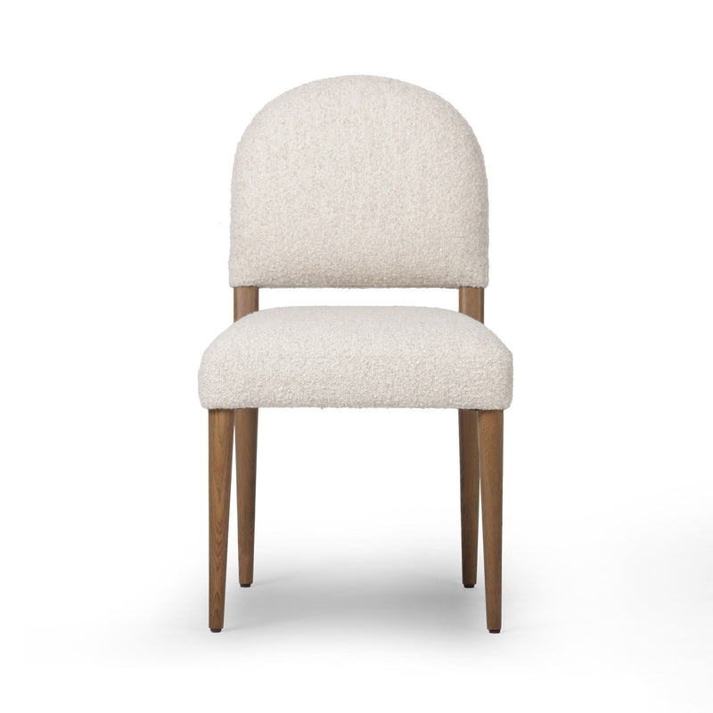 Indulge in the timeless elegance of the Abilene Dining Chair from Four Hands. Crafted from warm oak and adorned with a comfortable off-white or wool-blend seat, this chair seamlessly combines traditional design with modern comfort, while the tapered legs and arched back add a touch of sophistication to any dining room.