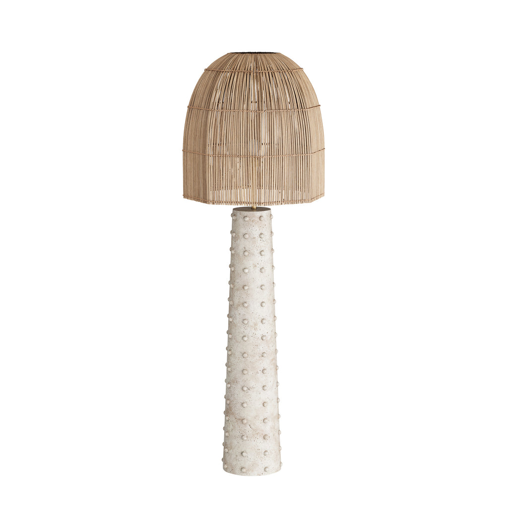 Exquisitely crafted, the Agnes Floor Lamp from Arteriors weaves playful materials into a sophisticated statement. Its sculptural coco rib shade lets light flow through unobstructed, while the mactan stone-finished resin base adds texture with its beaded spheres. Finished with antique brass detailing, this lamp brings elegance and refinement to any space.