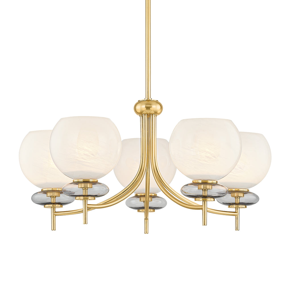 Elevate any space with the Alexia Chandelier from Mitzi by Hudson Valley Lighting. Its totemic composition boasts a large cloud glass orb stacked above an iridescent bubble. Lustrous Aged Brass metalwork pierces through, resembling delicately threaded beads. This versatile fixture combines whimsy and sophistication, making it a captivating focal point that seamlessly blends art and function.