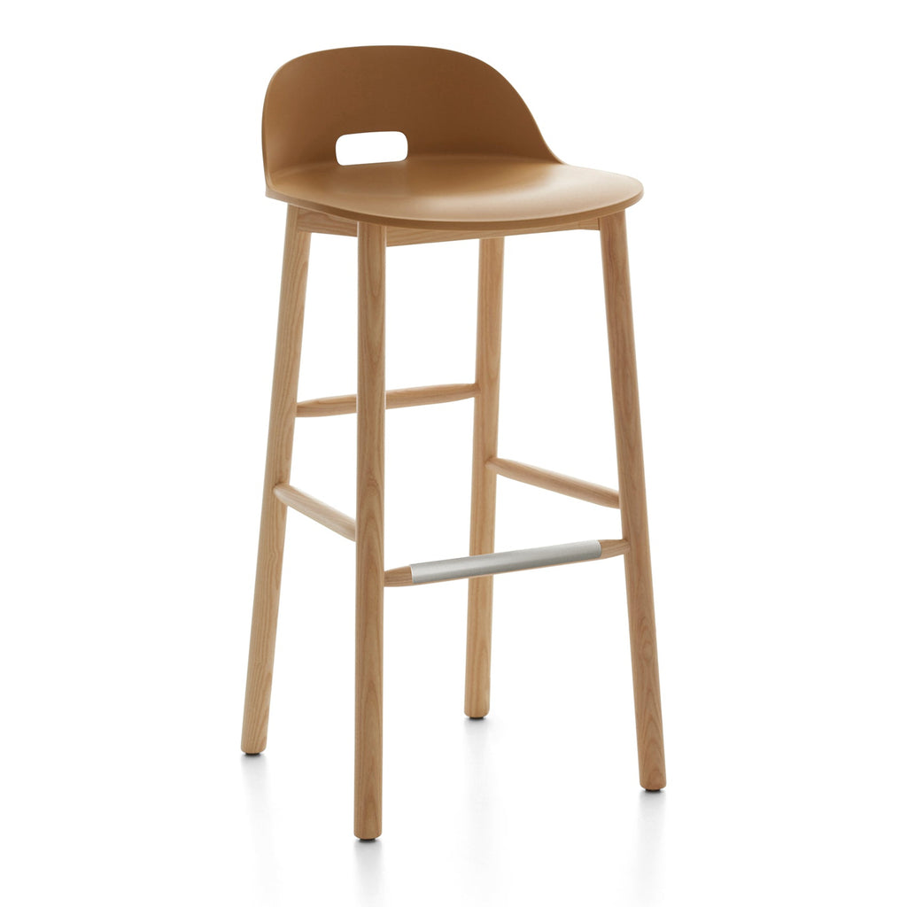 A collaboration between Emeco and designer Jasper Morrison, the Alfi Low Back Stool is a handsome, sustainably-sourced and durable piece of modern furniture. Crafted with a solid wood base and a wood-and-plastic composite seat engineered from material obtained directly from woodshops and plastic producers, this stool offers a subtly curved seat and low back height for a touch of support while seating --perfect for lining a kitchen island countertop or at-home bar-height table.