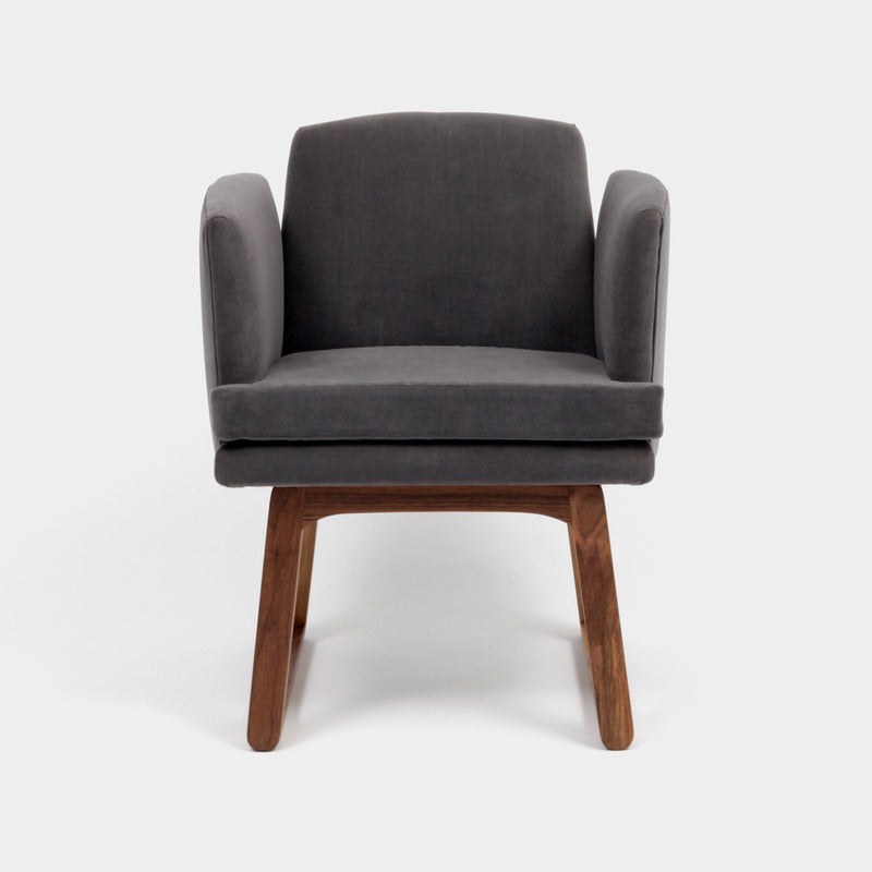 Aged velvet fabric, memory foam seat, solid walnut base, kiln-dried hardwood frame, double dowel joinery and corner blocks, loose cushion seat.