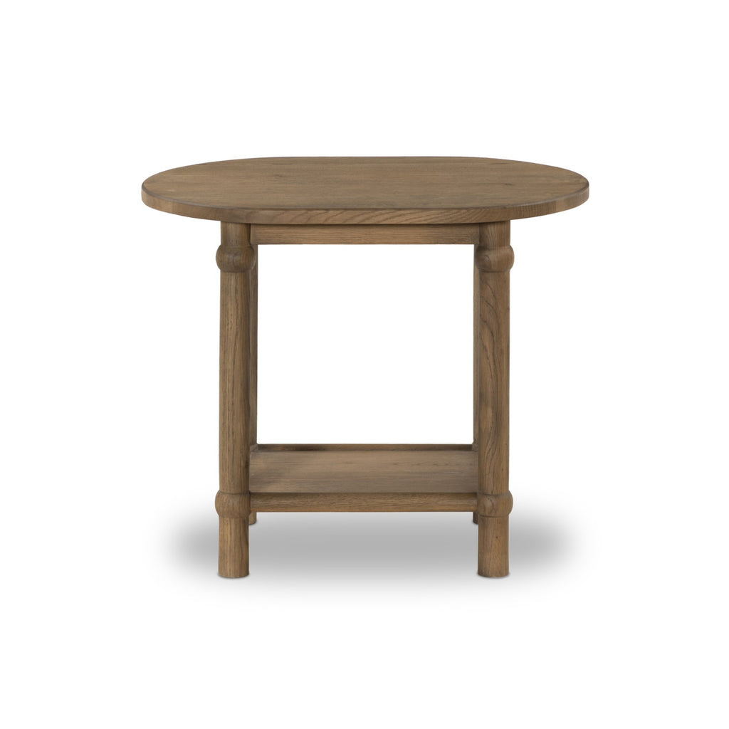 The Amber Lewis x Four Hands Charnes End Table exemplifies refined material appreciation through its thoughtfully executed design. Fashioned from natural oak with subtle antiquing that enhances its inherent warmth, this distinguished piece features a gracefully rounded bullnose edge that softens its architectural presence. The addition of a lower shelf introduces both visual lightness and practical functionality, while meticulously crafted round ball details provide articulation and evidence of superior craftsmanship.