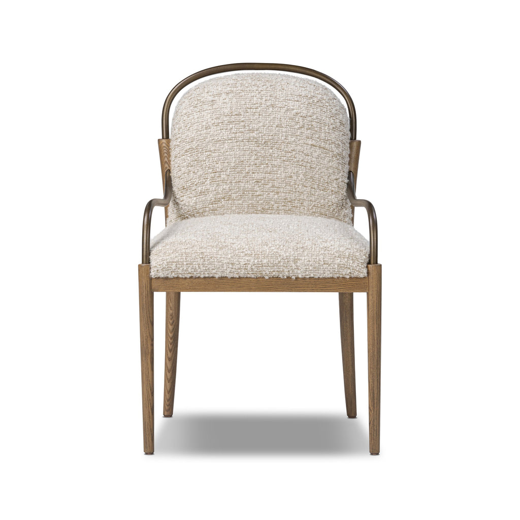The Amber Lewis x Four Hands Demi Dining Chair stands as an homage to traditional craftsmanship reimagined for contemporary dining environments. Its architectural composition artfully integrates ash wood with luminous burnished brass elements, creating a framework of refined material dialogue. The sophisticated S-spring seat construction provides exceptional comfort through time-honored engineering principles. Enveloped in sumptuous boucle-inspired upholstery with subtle linear patterning, the chair offers textural depth and dimensional interest while maintaining visual restraint.