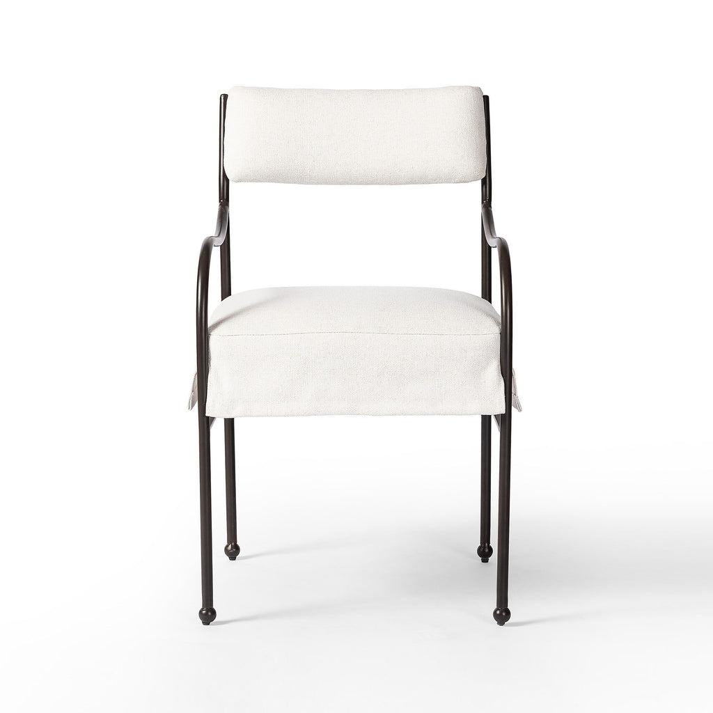 Discover the perfect blend of luxury and functionality with the Amber Lewis x Four Hands Nevin Outdoor Dining Chair. Made with a sustainable, zero-waste process, this French-inspired chair boasts a matte gunmetal frame with elegant curves and finial details. The white slipcover adds subtle movement and is crafted from luxurious Italian upholstery, making it durable and resistant to the elements. Elevate your outdoor dining experience with this exclusive design collaboration.