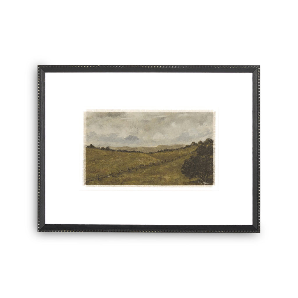 A design collaboration by Amber Lewis and Four Hands, "The Fenceline" is a captivating landscape by Southern California painter Lori Marie. Inspired by a life immersed in nature, she works with watercolor, oil, and acrylic to capture peaceful scenery. This piece is handmade in Austin, Texas, and presented on raw canvas for an organic feel.