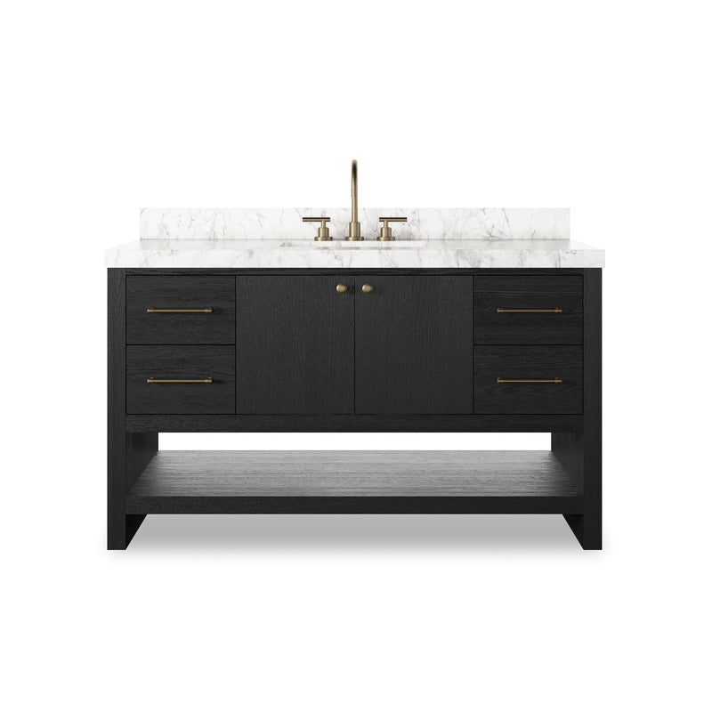 Set a calming, peaceful tone with the simple yet spacious Anthem Single Wide Vanity from Four Hands. Crafted with a wire-brushed, thick oak veneer base, it features a luxurious Carrara marble top and solid brass hardware. A mix of drawers, cabinets, and open shelving offers ample storage, all protected by a bath-safe sealant for moisture resistance.