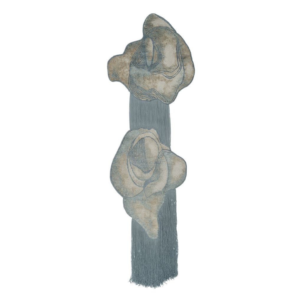 A study in intricate craftsmanship, Aquallence combines organic shell-formed shapes with long, flowing wool fringing, creating a dynamic yet calm expression. Linen and silk patterns emerge in contrasting structures against the hand-cut backdrop, forming an elegant tapestry that adds a unique and sophisticated edge to any interior space.