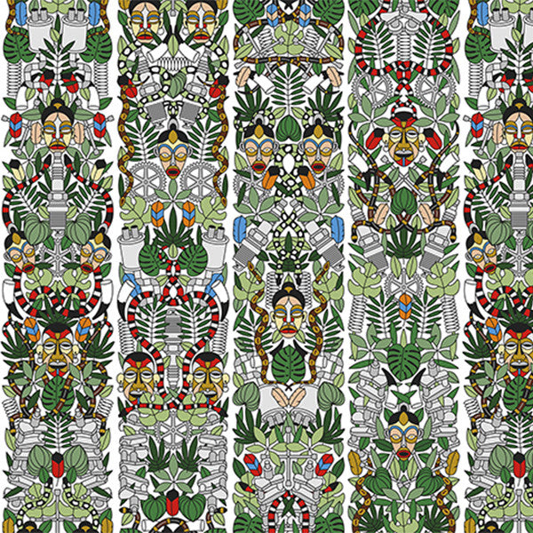 Since the spring of 2010, Studio Job has created striking backdrops for Viktor&Rolf’s shows. The beautiful backdrop of withered gray flowers for the 2013 fall/winter show in Paris inspired NLXL to collaborate with the Dutch Duo and create a special collection ‘Archives Wallpaper by Studio Job’. The fresh collection reflects a retrospect of the history of Studio Job. Archetypical drawings and universal symbols are combined as iconographic elements for patterns, compositions and embossing, ultimately creating seven designs: Industry, Labyrinth, Perished, Alt Deutsch, l’Afrique and Withered Flowers (in both black and white). Made from a non-woven paper with a mattee finish, each roll is nine metres by 48.7 centimetres.