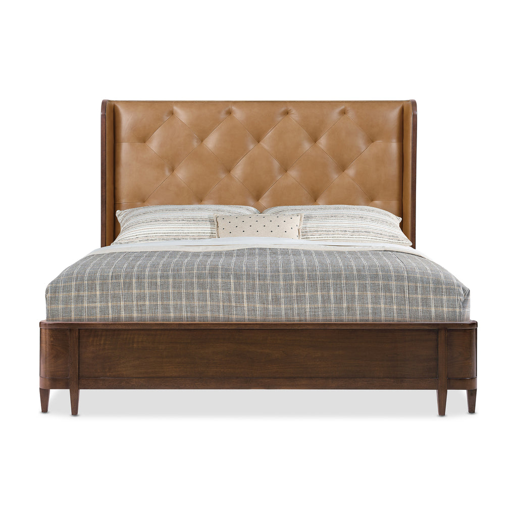 Anchor your bedroom retreat with the sophisticated presence of the Archives Leather Bed from Hooker Furniture. This shelter-style sanctuary features a dramatic winged headboard, luxuriously upholstered with classic button tufting. Resting on eight slender tapered legs that lighten the visual weight. It is a perfect fusion of historic character and modern comfort, creating a cozy and elegant focal point.