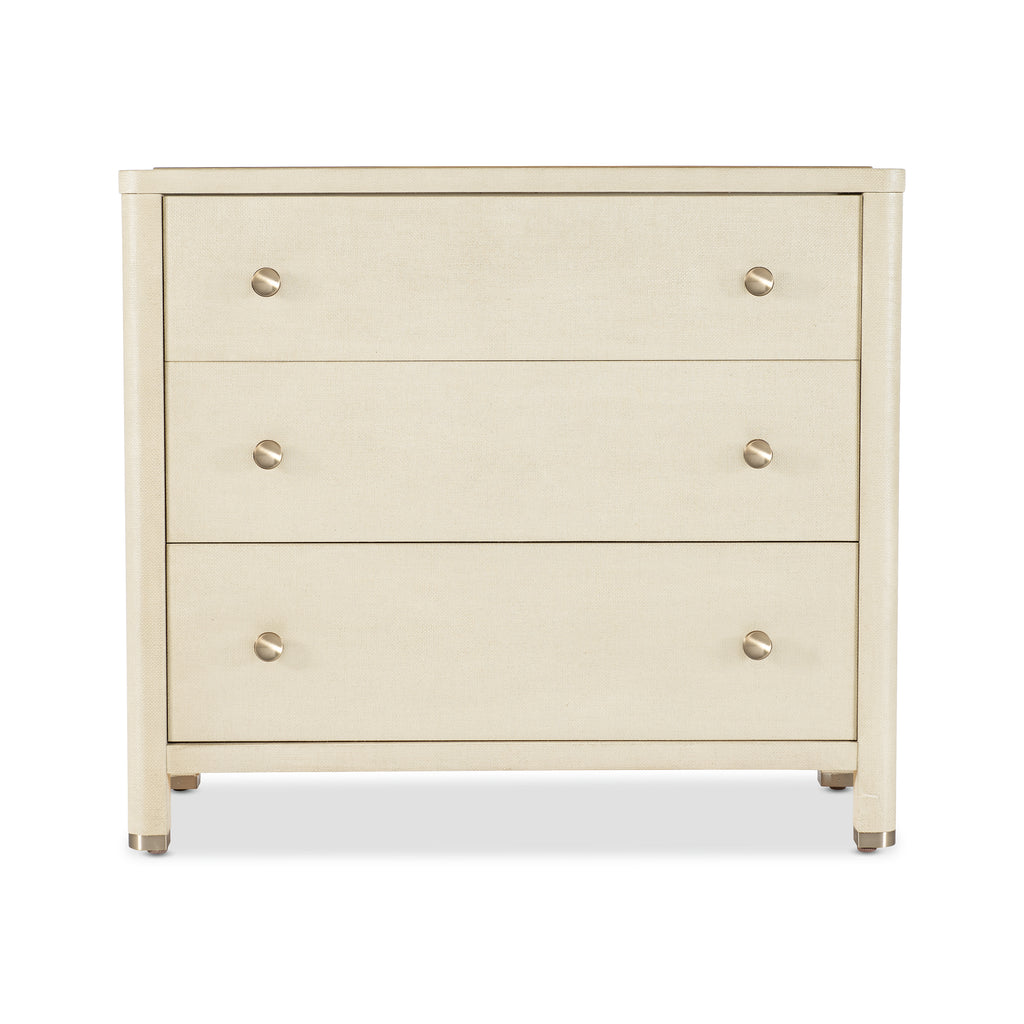 Enhance your favorite sleep space with the Archives Raffia Three-Drawer Chest from Hooker Furniture. Crafted with a raffia-wrapped exterior and Flax finish, this chest offers three spacious drawers with oak veneered sides and bottoms. The combination of raffia and woven cane details exudes coastal elegance. Beautifully store your belongings in style.