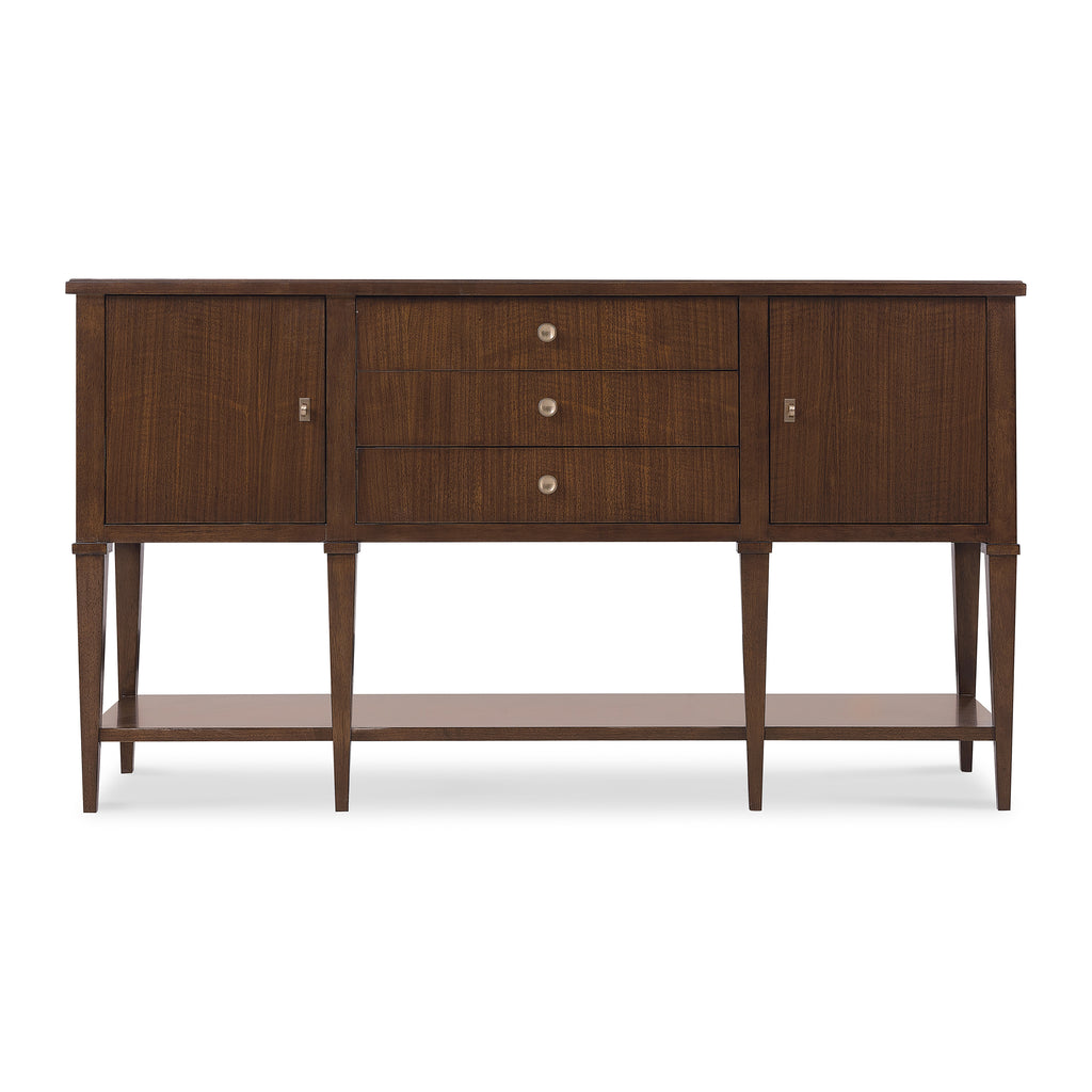 Take your dinner routine to the next level with the Archives Server from Hooker Furniture. Crafted with figured walnut veneers and Castle Grey marble top, its Classic Walnut finish and satin brass hardware exude luxury. With 2 doors, 3 drawers, and an adjustable shelf, storage is ample. The included silverware tray adds practicality.