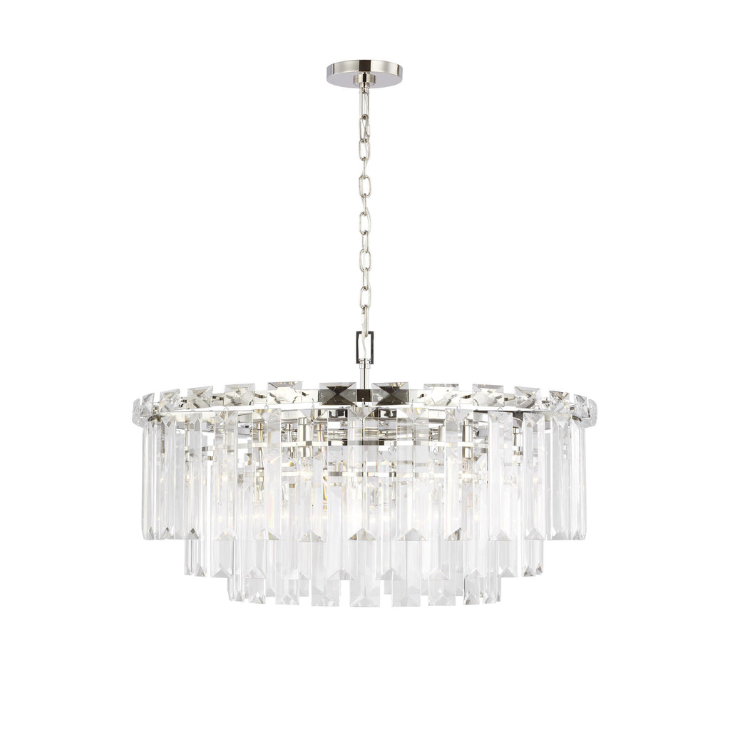 Illuminate your home with the stunning Chapman and Myers Arden Chandelier by Visual Comfort & Co. This luxe piece of lighting features a grand metal frame layered with brilliant cut clear glass crystals that let the warm light from its incandescent lamping escape and cast a sparkling glow. Make a spectacular statement with this glamorous and modern take on a traditional luminary.