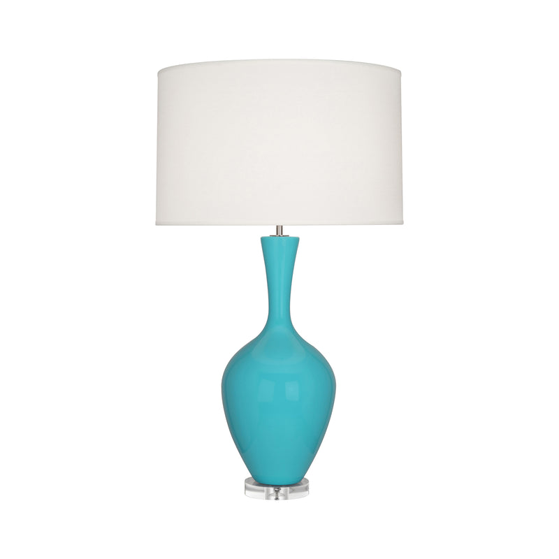 The Audrey Table Lamp from Robert Abbey combines elegant vase-like curves with premium materials, making it a sophisticated choice for modern side tables. Its clear Lucite disc base supports a glossy glazed ceramic body that gracefully tapers upward. The large pale Fondine fabric drum shade gently diffuses warm, inviting light, perfect for creating a cozy atmosphere. With a convenient hi-lo controller on the socket switch, you can easily adjust the brightness to suit your mood and setting.