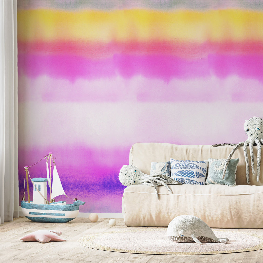 Aurora is a mural and ombre-like pattern designed to uplift a space to create a subtle, cheerful vibe. Color variations were created from an original soft blended watercolor painting.