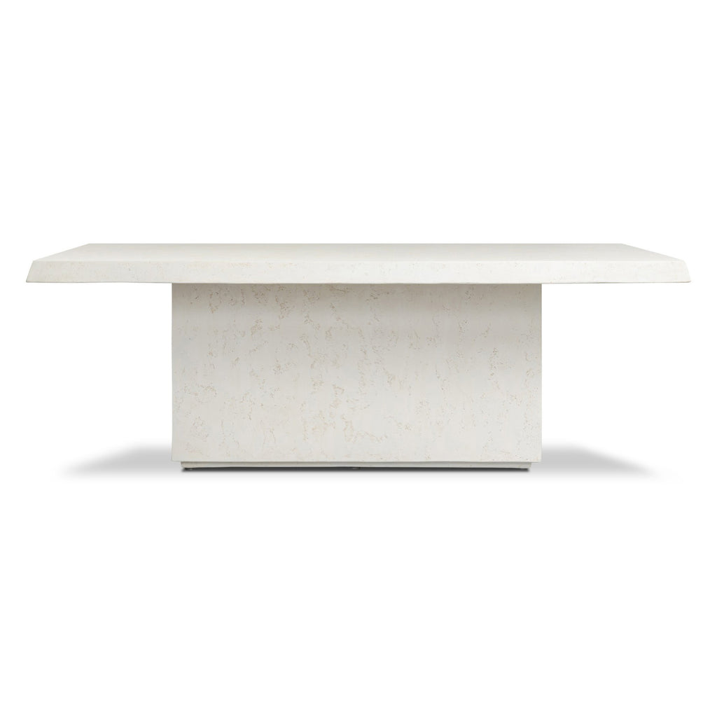 The Amber Lewis x Four Hands Avila Outdoor Dining Table exemplifies refined architectural presence through its considered proportions and material sophistication. Its rectangular pillar silhouette rises from a discreet plinth base with elegant restraint, while the aged white concrete finish achieves a nuanced parchment-like tactility that invites sensory appreciation. The table's reverse bevel edge introduces subtle visual complexity—an articulation that elevates structural necessity into design distinction.