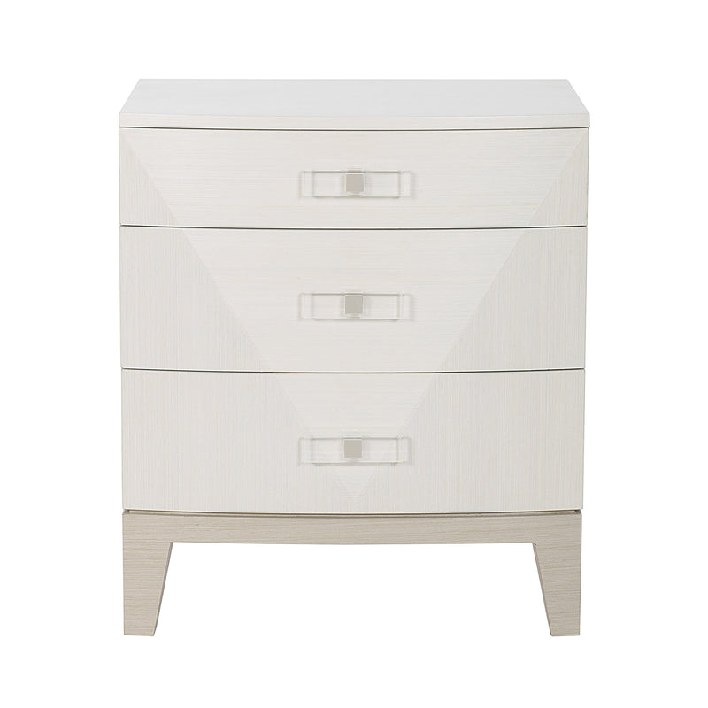 Ideal for smaller bedrooms, this compact version of the Axiom Nightstand brings together the same softly curved front and inverted pyramid drawer design. This superbly shaped and crafted nightstand provides visual interest and elegance. The drawers and case are composed of poplar solid wood and engineered faux anigre veneer in the Linear White finish. Each drawer is capped with clear, acrylic handle with brushed metal supports. The base of the nightstand warmly contrasts with the drawers using the Linear Gray finish.