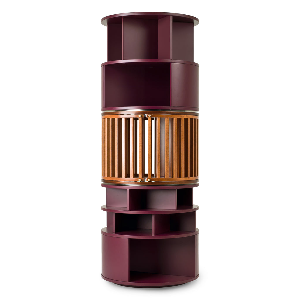 Enhance your living room with convenient and stylish storage with the Babel 6 Cabinet Unit from Fratelli Boffi. Handmade with natural mahogany and a violet-lacquered top and base, its modern design is inspired by the legendary Tower of Babel. With six separate units, this revolving cabinet is both functional and a unique statement piece.