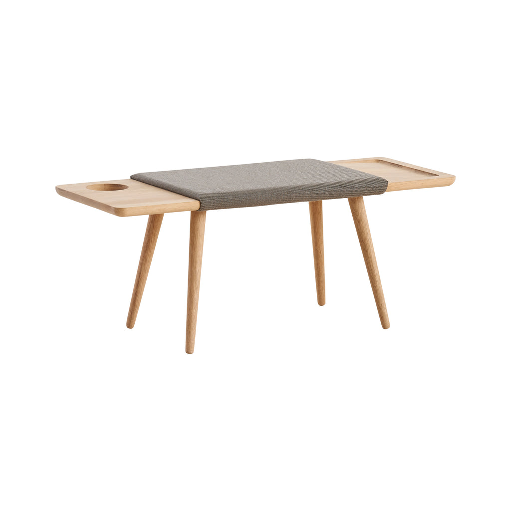 Indulge in luxury and functionality with the Baenk Bench from WOUD. Inspired by cardboard embroidery bobbins, this bench features a solid oak form with unique wooden veins, a circular-shaped hole for umbrellas or plants, and an upholstered center for added comfort. Perfect for hallways or bedrooms. Elevate your space with this elegant and exclusive piece.