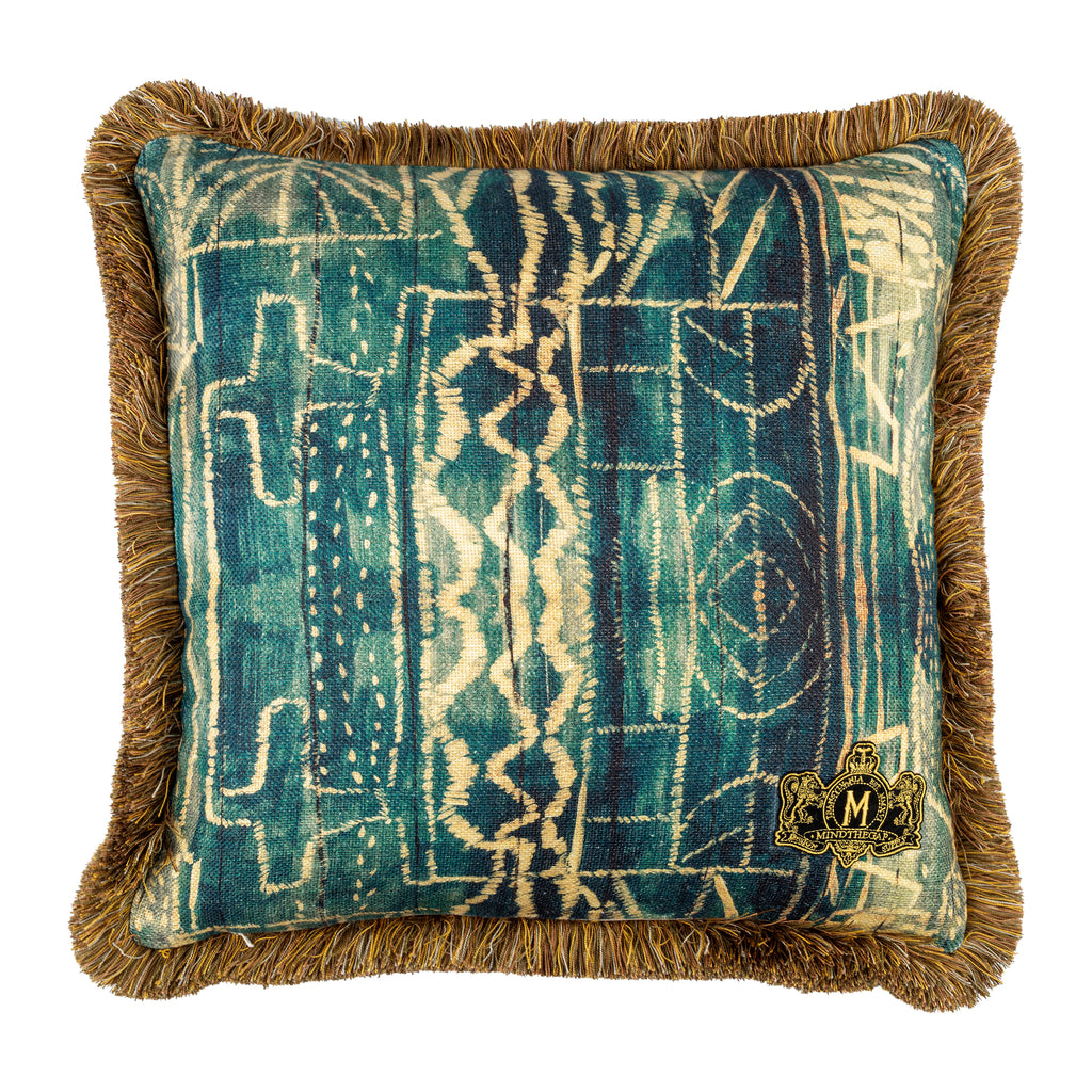 A beautiful bold cushion made of heavy linen featuring a vintage African design. Inspired by the culture of a native tribe dominant in Cameroon, BAMILEKE shows a handmade pattern exploring different shades of Indigo crossed with light cream lines. The cushion is finished with burnt gold fringing and comes with 100% duck feathers filling.