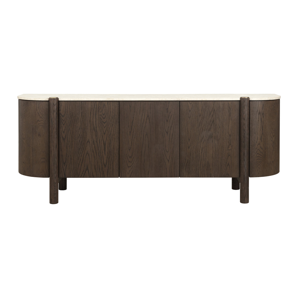 The Banyan Sideboard from Sunpan exudes luxury with its sleek curves and impeccable craftsmanship. Its cream marble top and solid oak wood veneer base elevate any room with a modern touch. A masterpiece you'll be proud to showcase, the cord management openings and ample storage space allow this sideboard to double as a chic media cabinet.