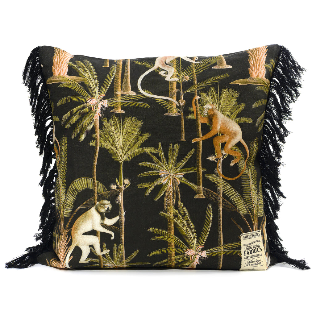 A tropical style design featuring impressive palm tree and various monkey illustrations on black background.