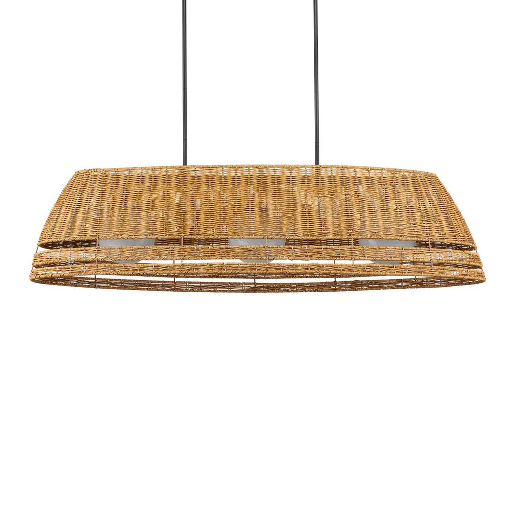 The perfect anchor for an indoor or outdoor dining space, the Barbary Oval Outdoor Chandelier from Currey & Company features a handwoven all-weather wicker shade shaped like an upturned boat. Supported by black powder-coated rods, it is designed to withstand outdoor elements and is wet location-tested for patios and porches. Three milk-glass globes glow softly through circular cutouts, adding a sophisticated ambiance. Its elongated oval form makes it an ideal centerpiece for rectangular outdoor dining tables.