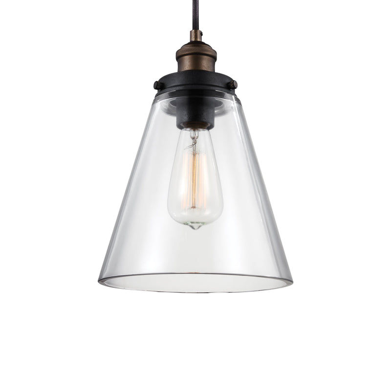 The Baskin lighting collection by Feiss is an ultra-clean, modern take on the classic antique socket pendant light. In three, iconic silhouettes (cone, chimney and dome), the Clear Thick glass 1-light pendants bring warmth and sparkle, while beautifully complementing all types of surroundings. The finishes offered include Polished Nickel for a more contemporary feel, as well as a unique combination of Painted Aged Brass with Dark Weathered Zinc which works well in a more rustic décor. Within the sleek and elegant shades, an incandescent Edison-style lamp (not included) becomes a dramatic focal point.