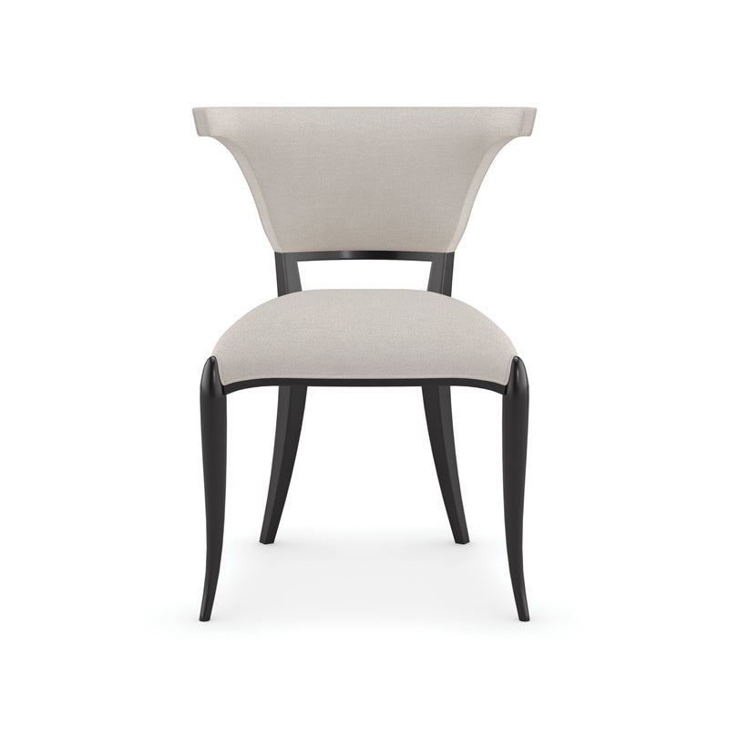 A beautiful, contemporary take on a classic form, the Be My Guest Dining Chair from Caracole is inspired by the timeless Klismos style of ancient Greece. This elegant chair is defined by its sleek silhouette, with a gracefully curved, concave backrest and splayed back legs for a touch of drama. The frame is finished in a deep Almost Black, which creates a rich contrast with the fine tailoring of the soothing, neutral performance fabric. A fusion of classical inspiration and modern livability, it’s a stunning and comfortable companion for any dining table.