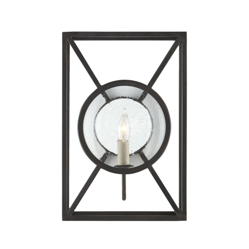 Add an air of pure sophistication to your space with the Beckmore Wall Sconce from Currey & Company. By renowned designer Lilian August, this wrought iron sconce features a cool x-shaped frame and a clear seeded glass panel that creates a charming display. The ambient light is amplified by a mirrored back panel for a truly luxurious feel in your bathroom or entryway.
