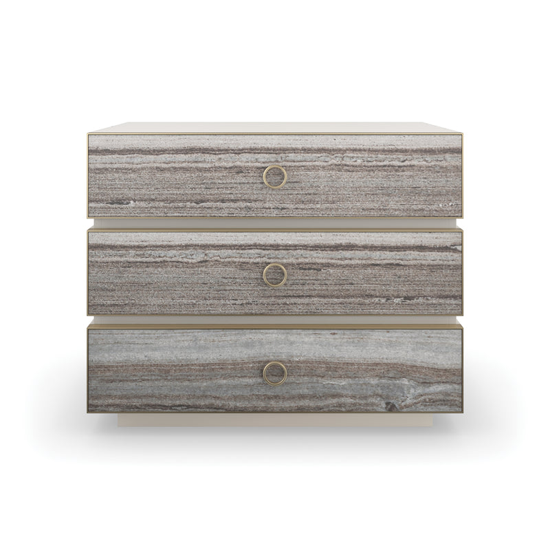 Grounding the room with a soulful sophistication, the Bedrock 3-Drawer Nightstand from Caracole introduces a compelling mix of texture and material. This beautiful nightstand is defined by its drawer fronts, which are crafted from polished gray sandstone with intricate natural banding that makes each piece unique. The organic elegance of the stone is minimally adorned with metal trim and small ring pulls in a soft Champagne Gold. A creamy Almond Milk finish on the case provides a soft contrast, creating an organic yet refined aesthetic that brings a sense of calm, natural luxury to any bedroom.