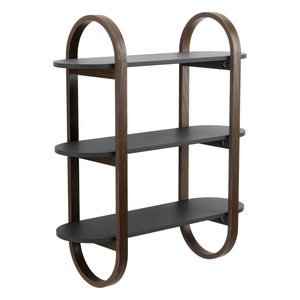 - Soft Curves: This modern wall shelf features three pill-shaped shelves with curved bentwood accents; total weight capacity of 45lbs. (20 kg)