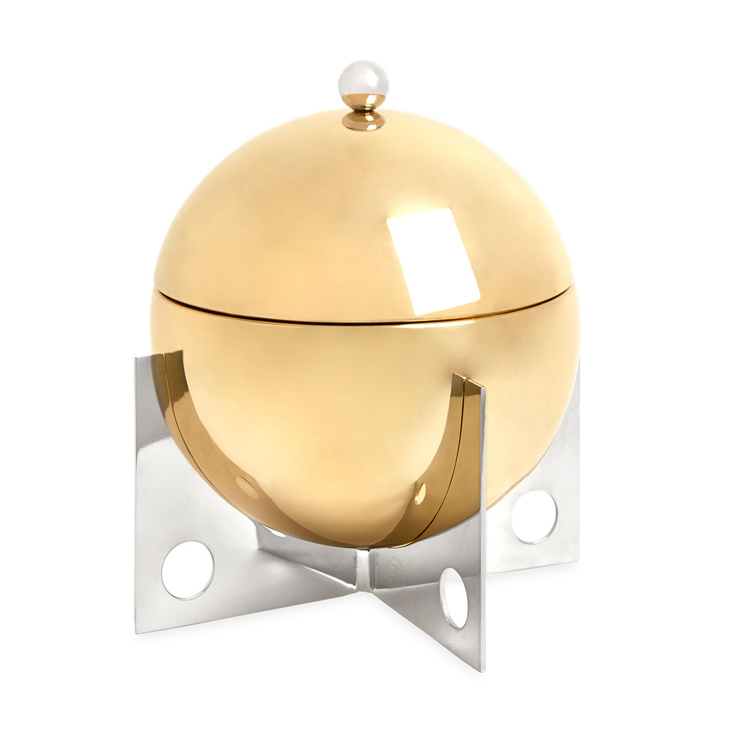 The barware tool you never knew you needed, the Berlin Ice Bucket from Jonathan Adler brings a glamorous, yet futuristic touch to your bar area or dining space. Crafted from mixed metals, the stainless steel base merges with the polished brass-finished container for a stunning take on a traditional ice bucket design. Accented by circular cut-outs and a bisected base, this ice bucket looks divine perched on your bar cart or positioned table side for easy access ice. The included stainless steel tongs make for easy retrieval and cooling of your favorite afternoon libation.