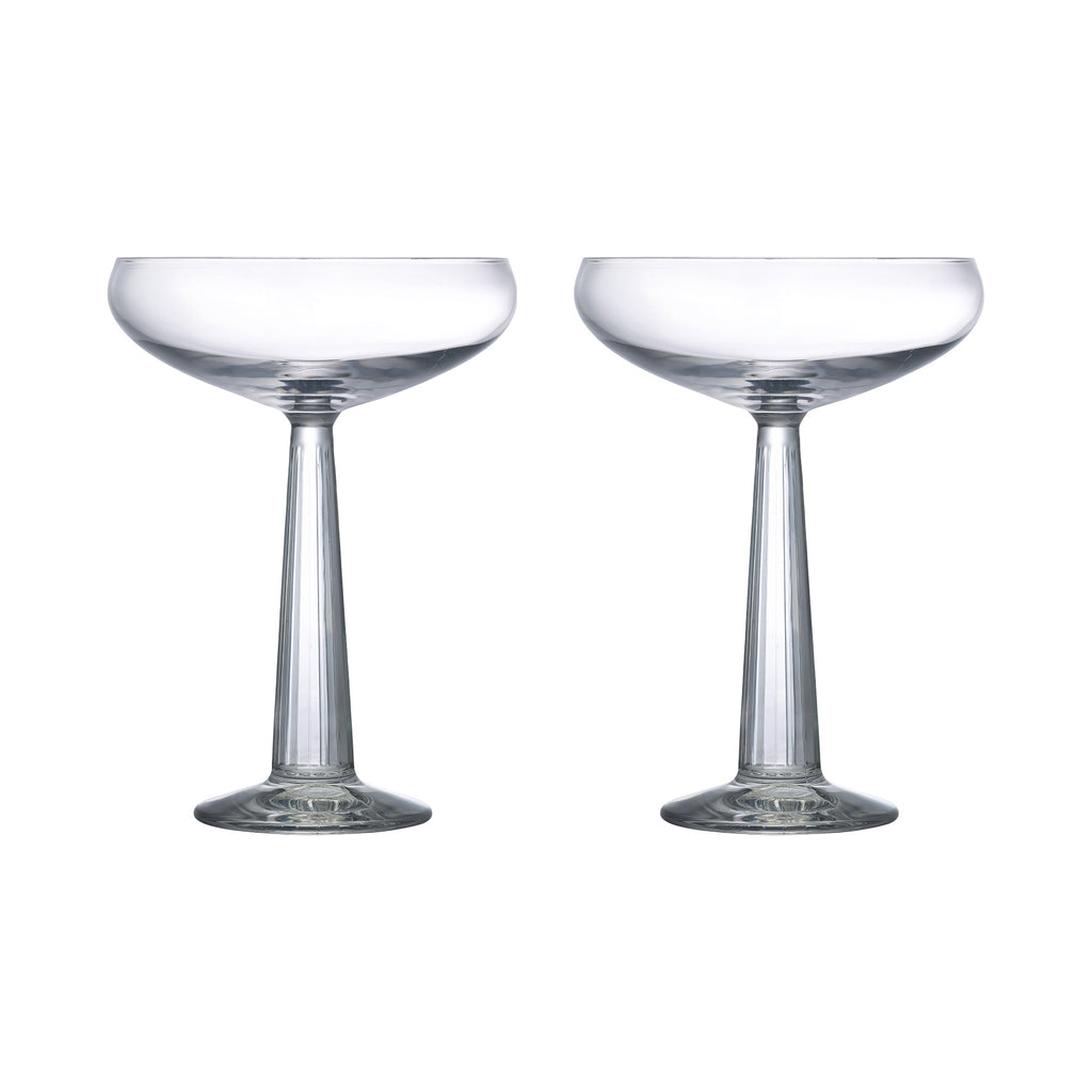 Introducing the Big Top Coupe Glasses by NUDE: a captivating pair of clear lead-free crystal glasses, featuring a generous bowl and a tactile stem, etched with a linear pattern. This contemporary classic offers a refreshingly modern take on the Big Top collection's circus-inspired aesthetic, elevating any drinking experience.