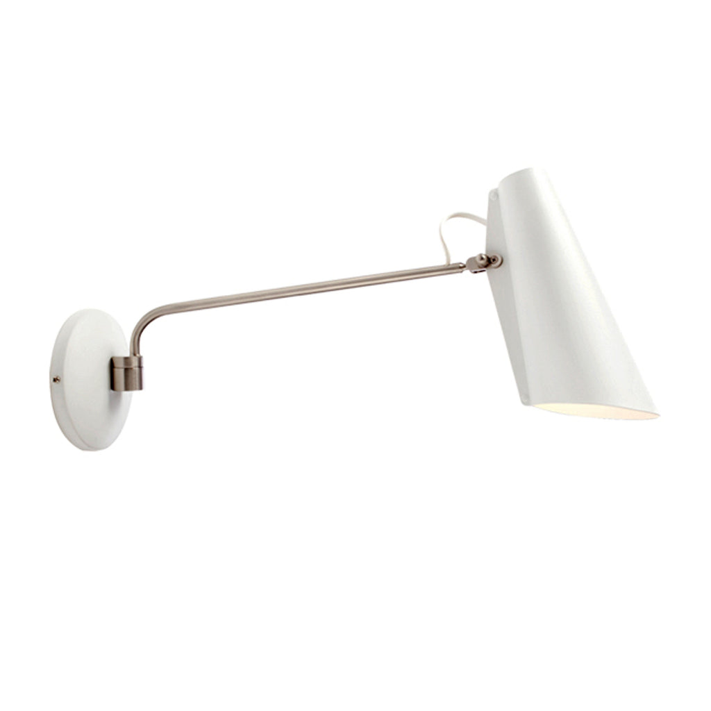 The Birdy wall light was designed by Birger Dahl in 1952, the midcentury modern style he achieved at the height of the important design movement expressing the gestalt of the era to a tee. The mounted version of this fixture has excellent DNA, as both the table and floor lamps were awarded the highly esteemed Golden Medal at the Milan Triennale. When Northern reintroduced this design classic, care was taken to preserve the original shape and highly functional features that originally made it such a well–loved light. The Birdy wall light comes in off-white or matte gray with a satin nickel finish and matte black with a brass metal finish. The inner shade is the same color as the exterior.