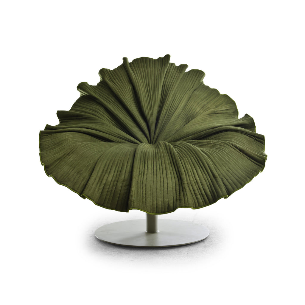 Experience the beauty of nature from the comfort of your home with the Bloom Swivel Easy Armchair from Kenneth Cobonpue. Crafted from fine Italian microfiber and supported on a sturdy, steel base, each chair is one-of-a-kind, featuring hundreds of hand-stitched petal-like folds elegantly radiating out from the center. Exquisitely soft, with a supportive, sculptural silhouette, this lounge chair makes an eye-catching addition to any modern interior.