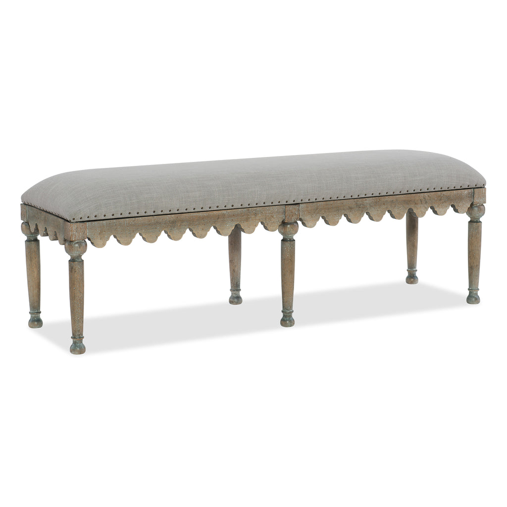Inspired by the elegant simplicity of Belgian design, the Boheme Madera Bed Bench from Hooker Furniture adds a touch of lyrical charm to any room. This multi-purpose bench features a beautifully crafted wood frame with a stylish, scalloped apron and a distressed, antique finish. The comfortable seat is upholstered in soft gray linen and accented with decorative bronze nailhead trim. A fusion of rustic charm and refined detail, it’s a sophisticated and versatile addition to a well-appointed home.