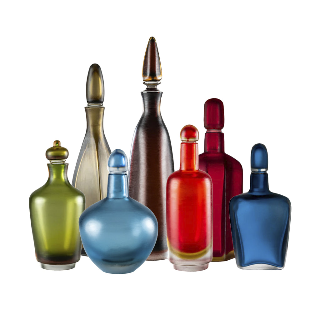 Experience luxury craftsmanship with the Bottiglia Incisa Bottle collection from Venini. Each bottle is handcrafted with precision and intricate cold engraving techniques. The etched glass surface is visually uniform and pleasing to the touch. Adorned with sinuous caps, these bottles exude timeless beauty with a fusion of bold and delicate colors. Elevate your collection with these exclusive bottles.