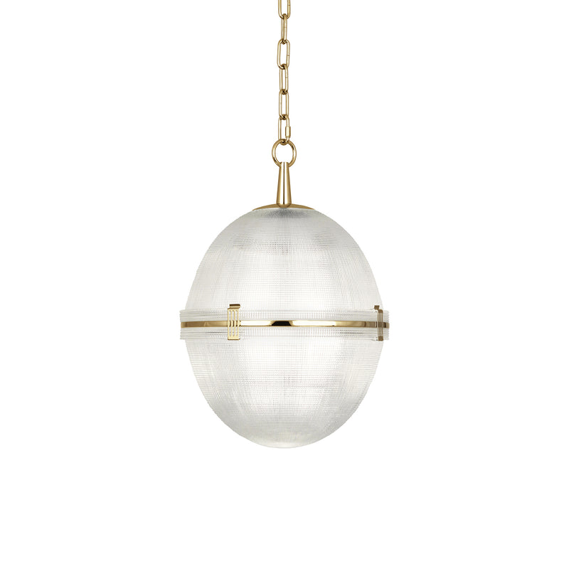 The Brighton Round Pendant Light from Robert Abbey features an elegant egg-shaped design crafted from Halophane glass, a material originally developed for lighthouses. Its prism-rich glass allows light to travel evenly without glare or hot spots. Two half domes are joined by sleek metal brackets and a thin metal band, adding subtle visual interest. Combining classic materials with a modern form, this pendant beautifully complements both traditional and transitional interiors.