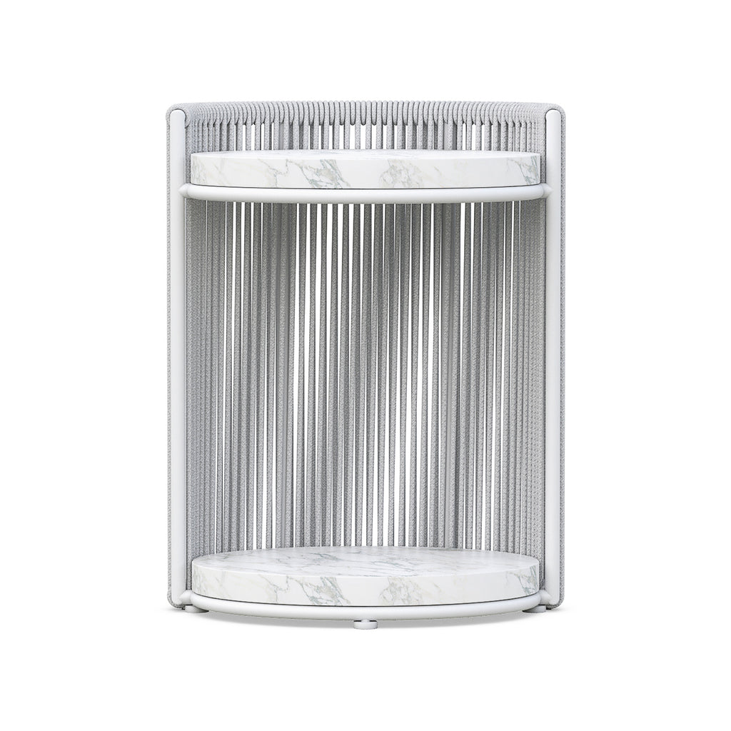Frame: Aluminum, All-Weather Rope - Honed Carrara Marble.