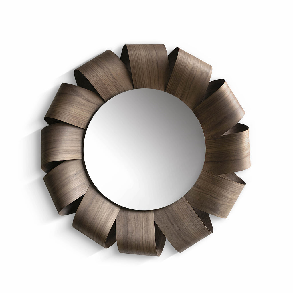 The Brisa mirror is a round wall mirror with a wooden flower-shaped frame, designed by Andrés Martínez for Nomon. The body is in natural walnut and the mirror either in silver or bronze.