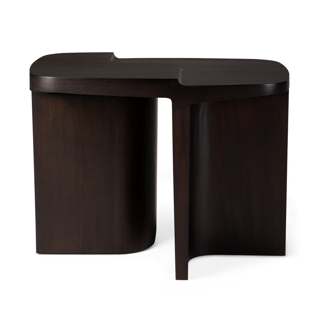 With its bold presence and a distinctive form, the Brutalist Side Table from Ethnicraft is a striking interpretation of functional furniture. Crafted entirely from solid mahogany, this piece is defined by its strong, architectural silhouette and unique carved openings, creating a beautiful balance of mass and negative space. A rich, rose brown stain and varnish finish enhance the natural grain of the wood, adding depth and warmth to its sculptural shape. A fusion of powerful form and refined material, it brings enduring character to any setting.