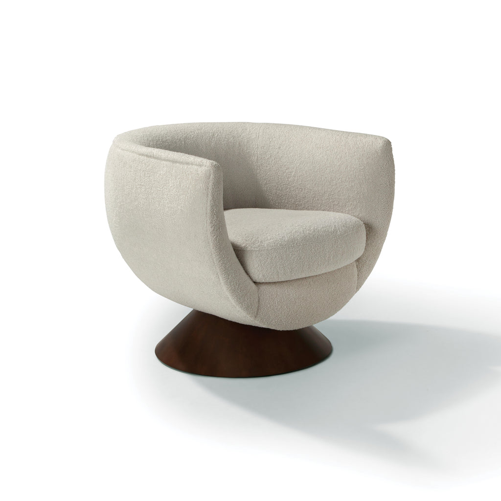 Designed for being social, or to lounge and cocoon, the Bubble Swivel Chair from Thayer Coggin is an instant classic. Influenced by the Pop Art movement, this lounge chair features a solid wood base with a spherical frame upholstered with your choice of fabric or leather. Playful, yet classically modern, this swivel chair offers a soft seat for any occasion.