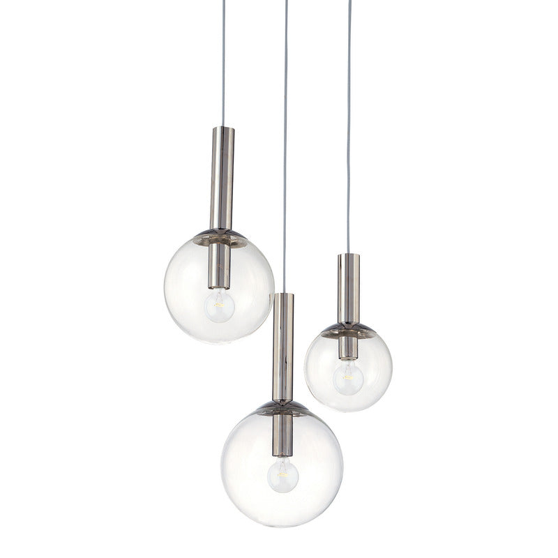 Bubbles 3-Light Pendant, a playful, casually yet classic icon of mid-century modern lighting design is of infinite variety and proportions. Its straightforward clarity echoes the modern pathos of form from function as its aesthetic basis. Featuring shades in multiple sizes and polished nickel metal support.