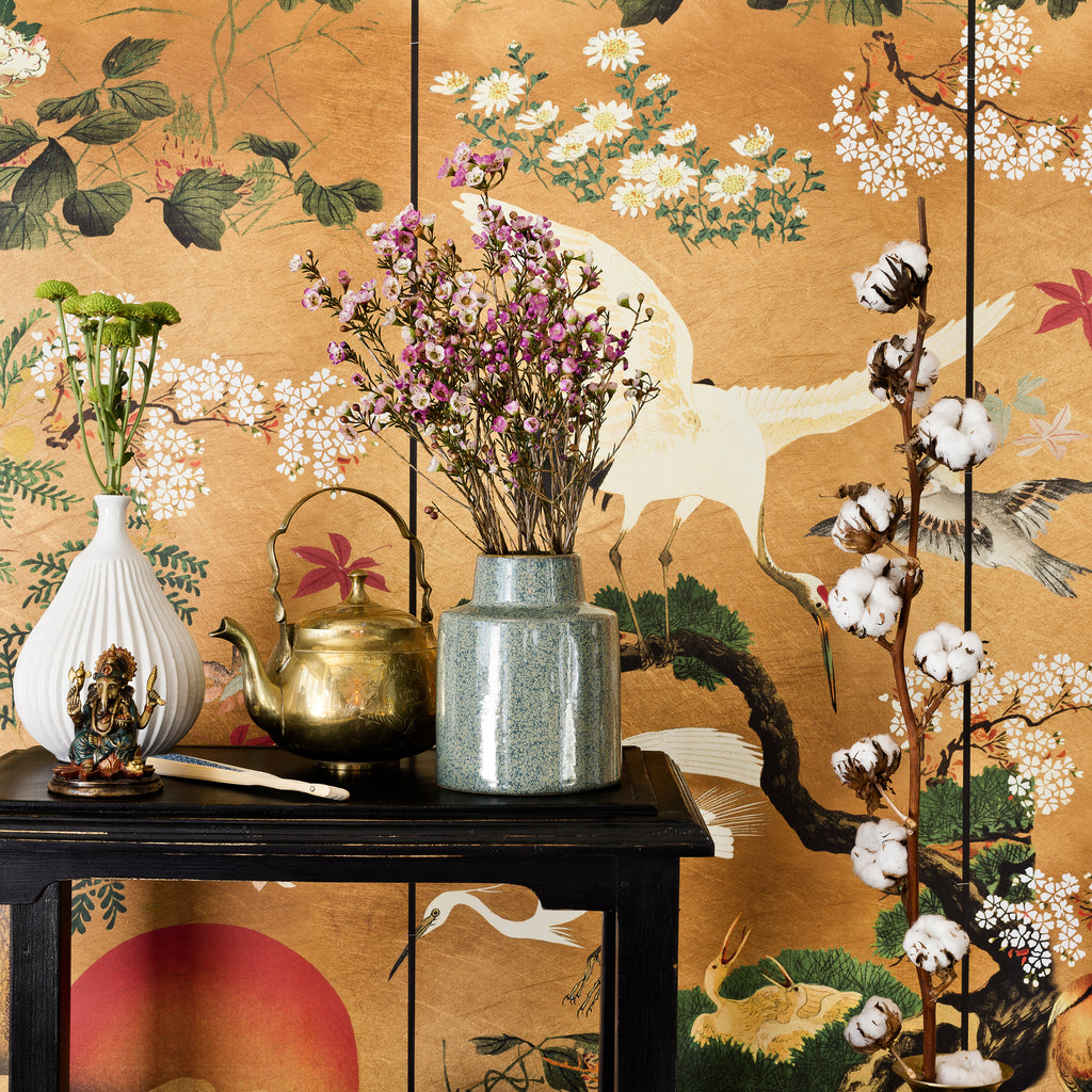 An elegant and ethereal traditional Japanese design, the Byobu Standard Wallpaper from Mind the Gap creates a unique and relaxing atmosphere in your home. With painted details of birds, florals, and trees, this traditional design tells a story within your space. Ideal for a living room, bedroom, or even a meditation space, this wallpaper features a textured matte surface and is non-woven so it won't shrink or expand over time.
