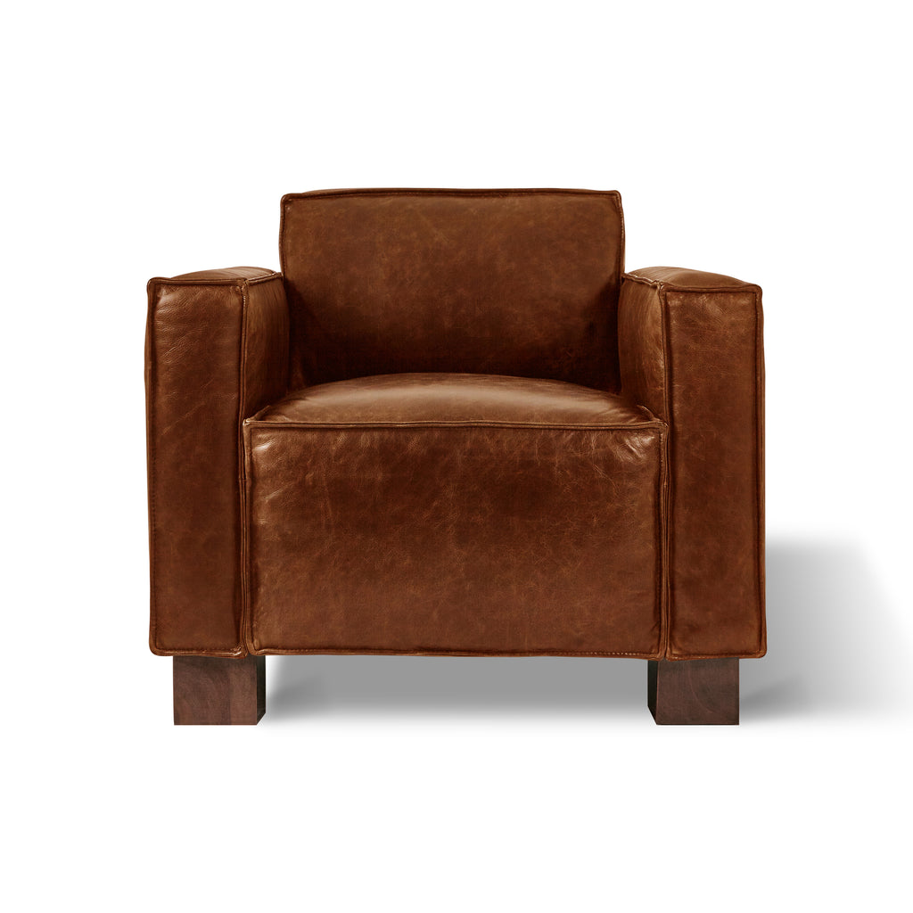 Indulge in the luxurious comfort and timeless design of the Cabot Lounge Chair from Gus. Its tight seat and back, French seams, and wood block feet exude sophistication, while the vintage leather upholstery adds a touch of exclusivity and will only improve with age. Embrace the best of both worlds with this modern twist on a classic masculine style.