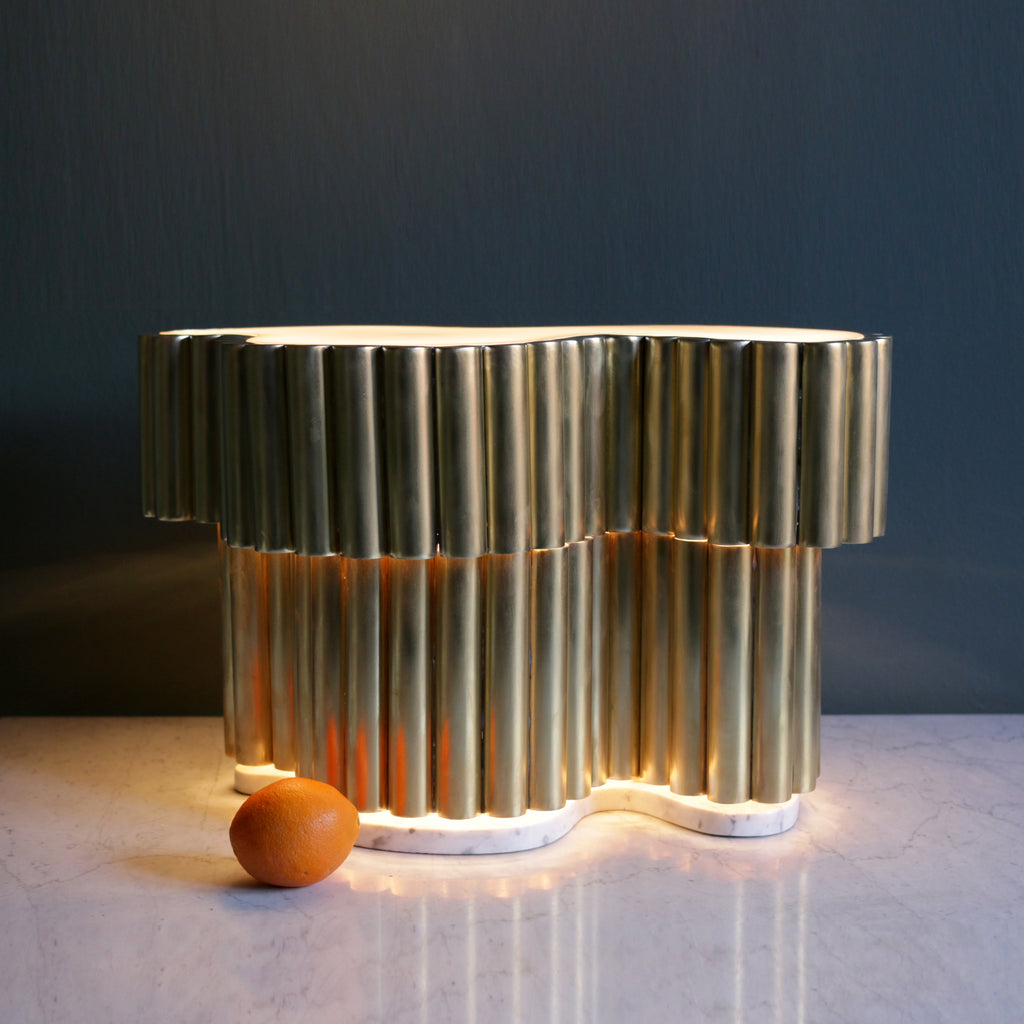 Indulge in the decadent sophistication of the Canele Table Lamp from Popham Design. Inspired by the iconic French pastry, this handcrafted lamp features brass fluting reminiscent of the sweet caramel crust. Each piece is unique, with amoeba-like undulations, and ships with a high-CRI LED for optimal lighting. Elevate your space with this exclusive, one-of-a-kind piece.