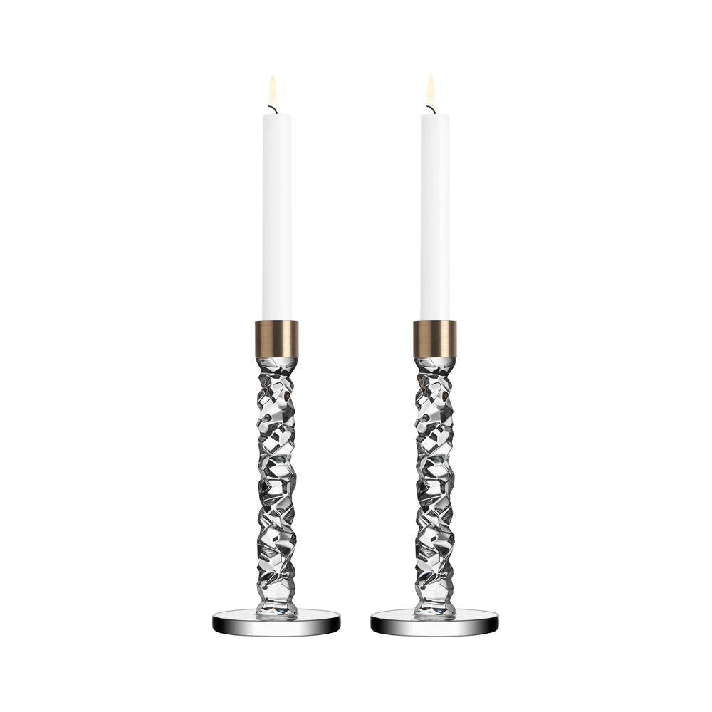 The Carat collection is based on a contemporary interpretation of the traditional cut glass for which Orrefors is world-renowned. The irregular geometry produces beautiful reflections of light in the crystal. The small candlestick in clear glass is available as a set of 2 with details in bronze or stainless steel.
